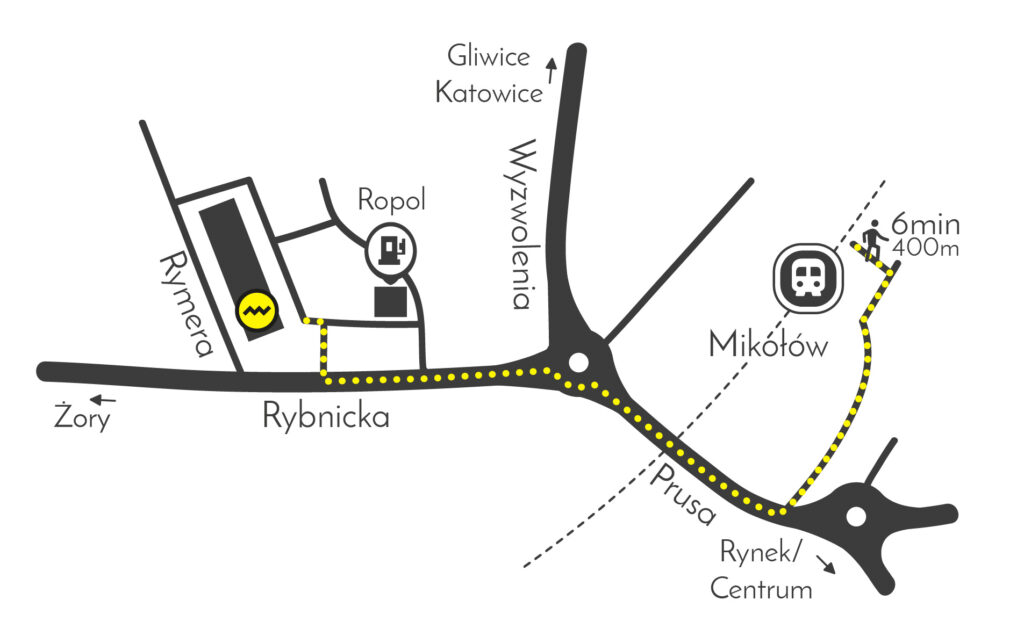 Sala znajduje się w odległości kilku minut piechotą od głównego dworca autobusowo-kolejowego w Mikołowie. Zerknij na mapkę poglądową.